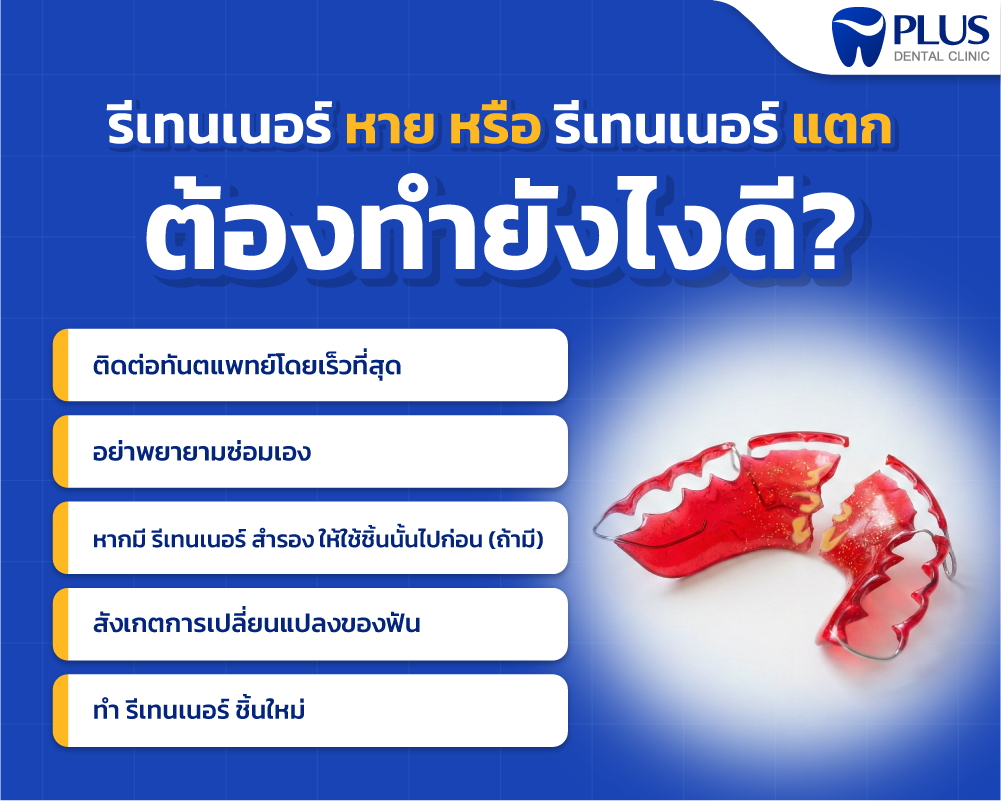 หลังจากที่เราได้ทุ่มเทเวลาและเงินทองไปกับการ จัดฟัน จนได้รอยยิ้มที่สวยงามสมใจ สิ่งสำคัญที่สุดคือการรักษารอยยิ้มนั้นให้อยู่กับเราไปนานๆ ด้วยการใส่ รีเทนเนอร์ อย่างสม่ำเสมอ แต่บางครั้งเรื่องไม่คาดฝันก็อาจเกิดขึ้นได้ เช่น รีเทนเนอร์ หาย หรือ รีเทนเนอร์ แตก ซึ่งเป็นสถานการณ์ที่สร้างความกังวลให้หลายคนอย่างมาก บทความนี้จะบอกคุณว่าควรทำอย่างไรเมื่อเกิดเหตุการณ์ไม่คาดฝันกับ รีเทนเนอร์ ของคุณ พร้อมย้ำความสำคัญของการดูแล รีเทนเนอร์ เพื่อรอยยิ้มที่คงที่ และคุณสามารถมาทำ รีเทนเนอร์ ใหม่ หรือปรึกษาปัญหาเกี่ยวกับ รีเทนเนอร์ ได้ที่ PLUS Dental Clinic ทุกสาขา ซึ่งมีทีมทันตแพทย์ที่มีประสบการณ์พร้อมดูแลรอยยิ้มของคุณ